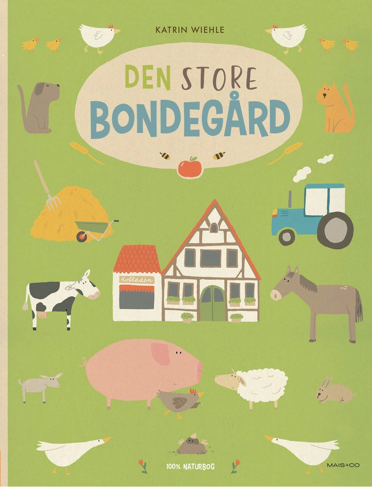 Smuk, tale, tælle- og finde bog i stort format Geder og får græsser på marken, grise og køer venter i stalden på at komme ud. Gæssene skræpper i gården, mens hønsene har travlt med at lægge æg. Traktoren rasler over markerne, men i haven tager bondemand