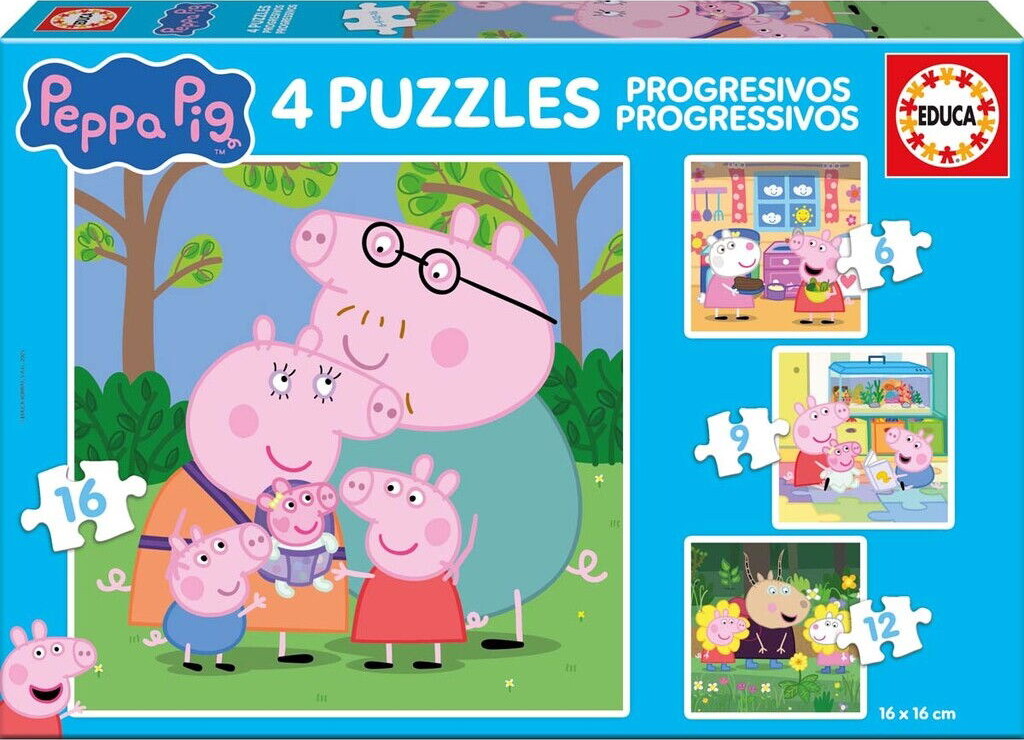Denne æske indeholder fire puslespil med varierende antal brikker, fra 6 til 16, hvilket giver...