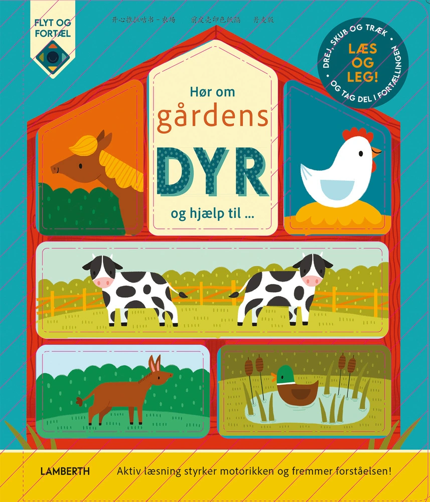Meget enkle, farverige billeder af genkendelige dyr på bondegården med en kort tekst, som lægger op til aktiv læsning.