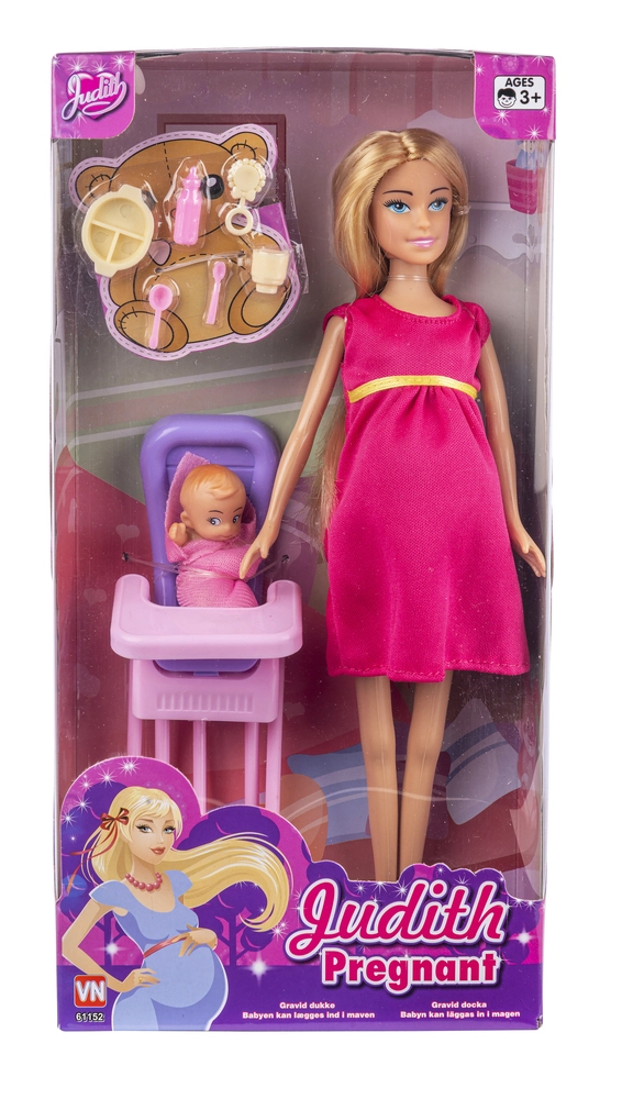 Gravid Judith med højstol og tilbehør. Med baby der kan lægges ind i maven. Flere varianter. Fra 3 år.