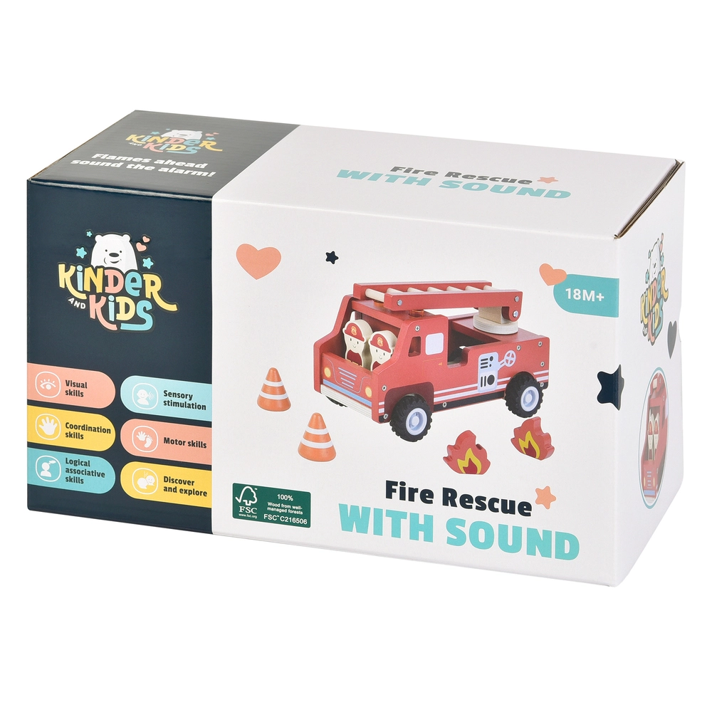 Kinder and Kids Brandbil med lyd er lavet i træ og leveres med brandmænd, kegler og flammer til realistisk leg. Bilen har en stige, der kan hæves, og lyd, der gør legen endnu mere spændende og livagtig. Batterier medfølger ikke - kræver 2 x AAA batterie