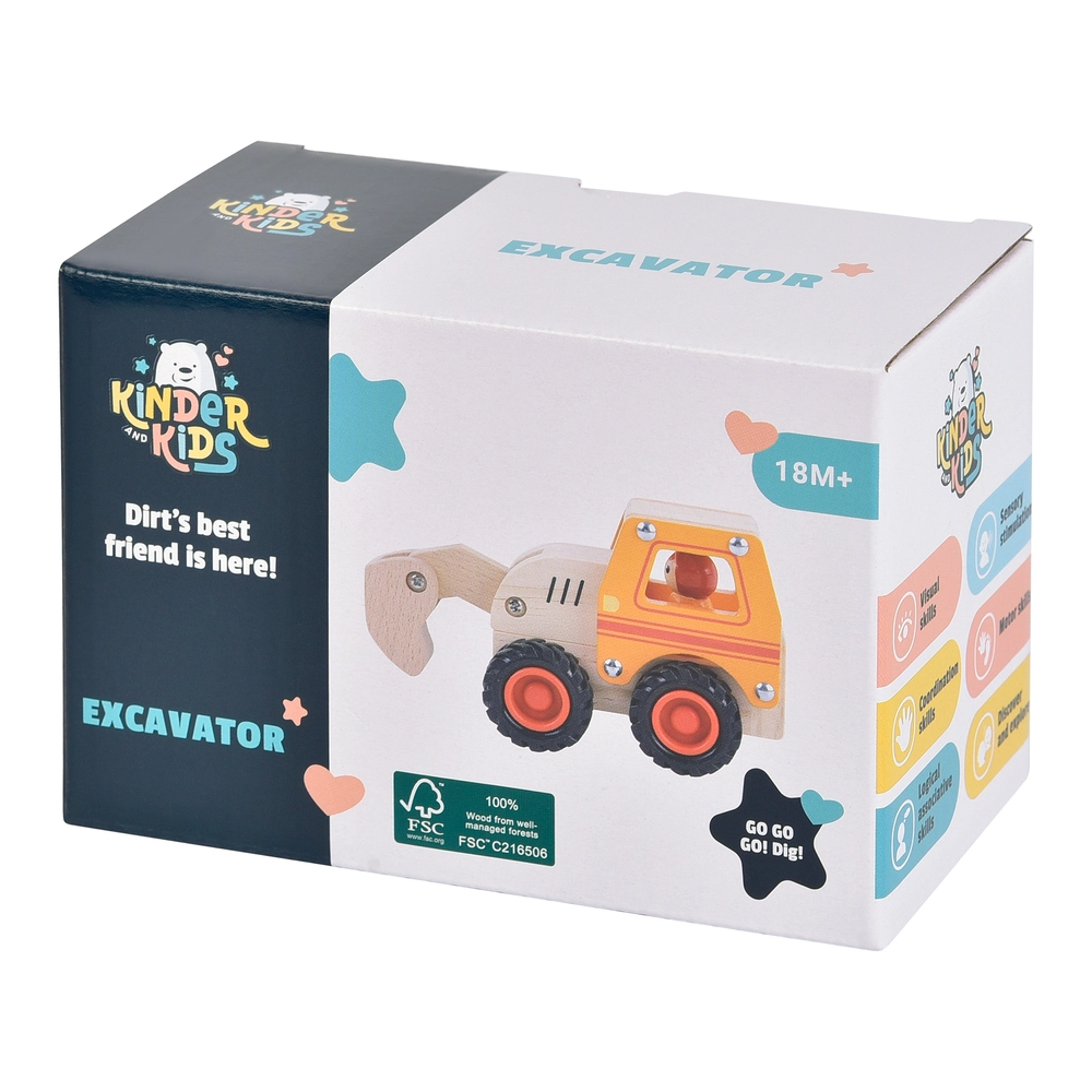 Kinder and Kids Gravemaskine er fremstillet i træ og har et robust design, der passer perfekt til små hænder. Med den bevægelige grab foran kan børnene lege byggeplads, samle og flytte små genstande, mens de udforsker maskinførerens verden. Fremmer rollel