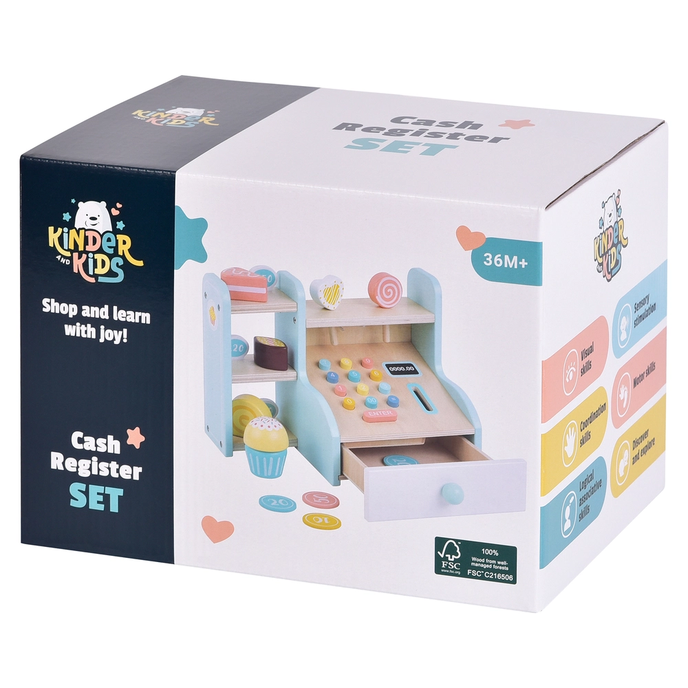 Kinder and Kids Kasseapparat er fremstillet i træ og leveres som et komplet sæt med mønter, kort, varer og en skuffe, der kan åbnes. Sættet indbyder til rolleleg, hvor børnene kan lege butik, øve sig i at betale og tage imod penge, samt udvikle forståelse