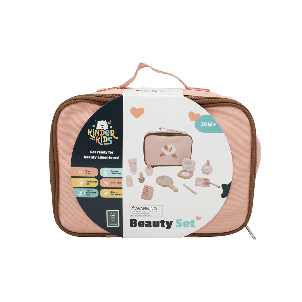 Kinder and Kids Skønhedssæt er lavet i træ og indeholder alt, hvad barnet skal bruge til at lege frisør eller makeup-artist. Sættet kommer i en fin rosa stof-taske, der gør det let at opbevare og tage med. Med spejl, børste, hårtørrer, neglelak, pudder og