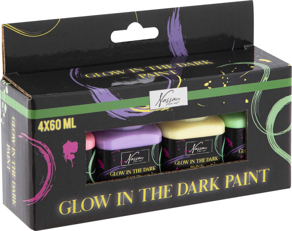 Slip kreativiteten løs - selv i mørket! Dette sæt med 4 bøtter acrylmaling á 60 ml i Glow in...