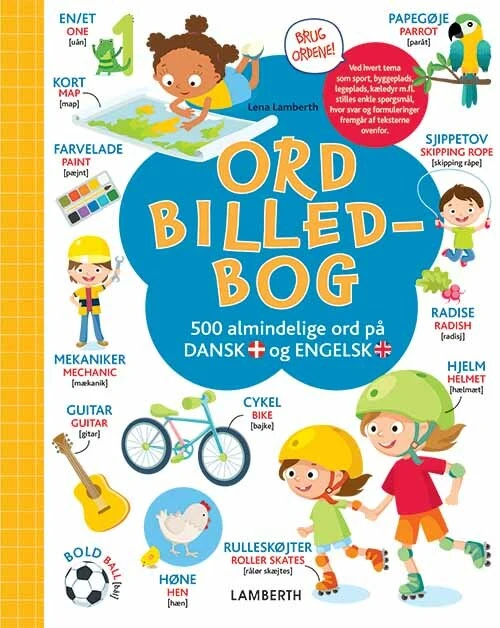 20 opslag med illustrationer over forskellige temaer som farverne, talrækken, årstiderne, sport, hjemme, erhverv, parken, skolen, rummet m.fl. præsenteres et antal forskellige ord og enkle sætninger. Børnene opfordres til helt eller delvis at gentage sætn