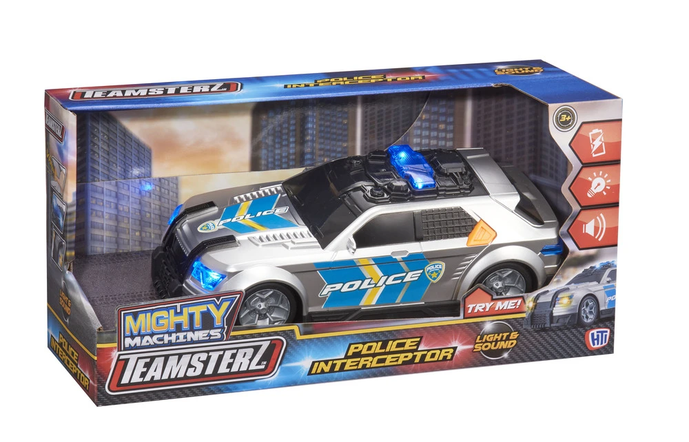 Cool politibil med blinkende blå lys, fungerende forlygter og sirener. Bilen har fritkørende hjul og realistiske motorlyde for ekstra spænding i legen. Velegnet til børn fra 3 år.