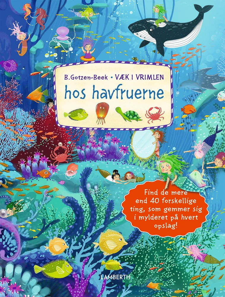 De søde, farverige illustrationer gemmer på mange spændende ting. Løs opgaverne og lær navnene at kende på mere eller mindre fantasifulde væsner i havet. Du kan også tælle havfruer, konkylier, krabber eller nogle af de mange andre detaljer. Der er en mass